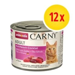 La alimentación natural de los gatos está basada únicamente en carne. Una alimentación basada solo en componentes vegetales no es adecuada para los gatos, ya que su organismo no puede absorber todos los nutrientes esenciales. Además, los cereales provocan con frecuencia intolerancias alimentarias y se digieren con dificultad. Por esta razón, Animonda Carny Adult no contiene cereales añadidos; tampoco soja, que también tiene un alto potencial alergénico.