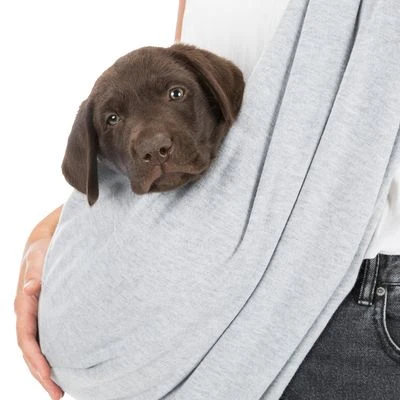 Bolso para transportar a cachorros y perros pequeños de hasta 5 kg cerca del cuerpo. Ofrece sensación de seguridad. Material elástico y con correa corta. Color: gris claro/menta