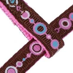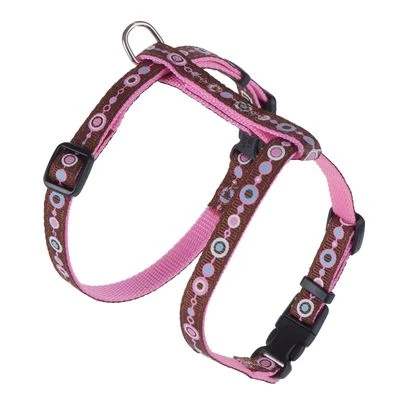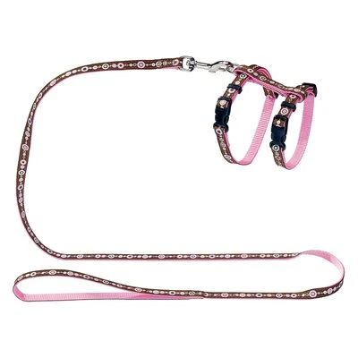 Arnés para gatos y cachorros con un contorno de pecho de hasta 37 cm y correa de 120 cm de largo y 1 cm de ancho. Arnés completamente ajustable y con cierres de clic. Color: rosa y marrón.